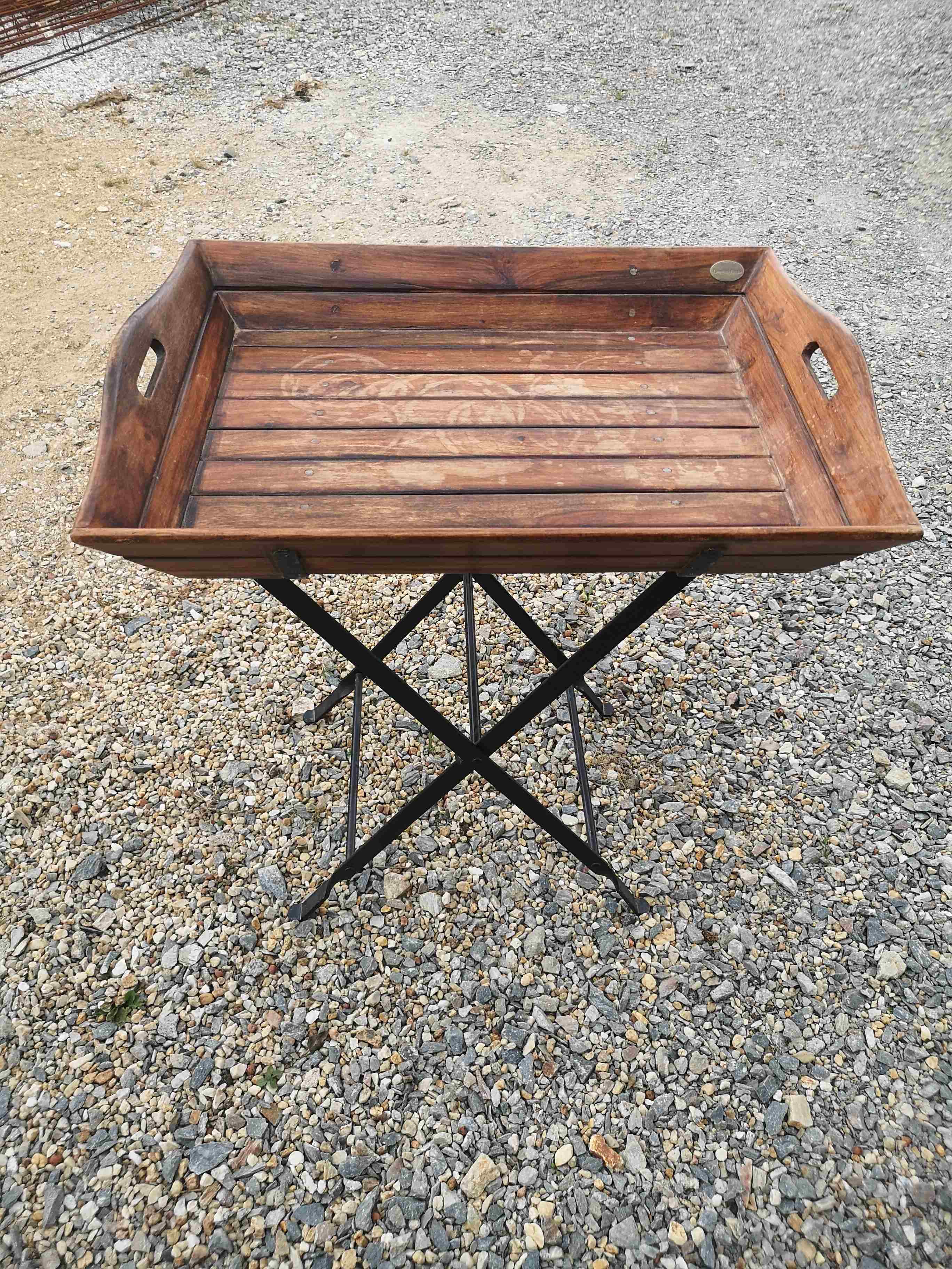 Constituée d’un très grand plateau en bois exotique, la teinte délavée et les traces de services ont eu raison d’une customisation plus dans l’air du temps.